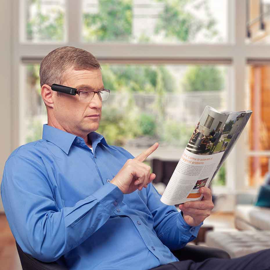 Das intuitiv bedienbare Gerät ist in etwa so groß wie ein Finger und damit ein unauffälliges Hilfsmittel. Dank der magnetischen Befestigung lässt sie sich an nahezu jede beliebige Brillenfassung anklippen –perfekt für zu Hause und unterwegs.